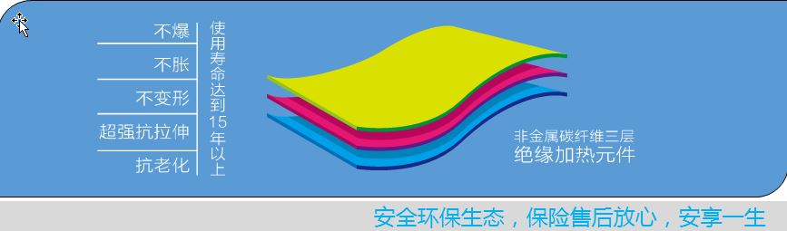采用内置非金属碳纤维三层绝缘加热元件,通电后的碳纤维中的碳分子做“布朗运动”,在产生热量的同时,会产生85%左右的远红外线来辐射热量。使用过压、过流、超温三重保护白金触点高品质温控器,无电磁场和有害波,无触电风险,符合国家3C认证。